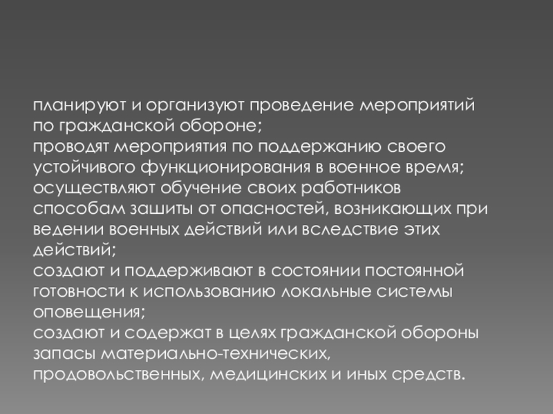 Слайд 9планируют и организуют проведение мероприятий по гражданской обороне;