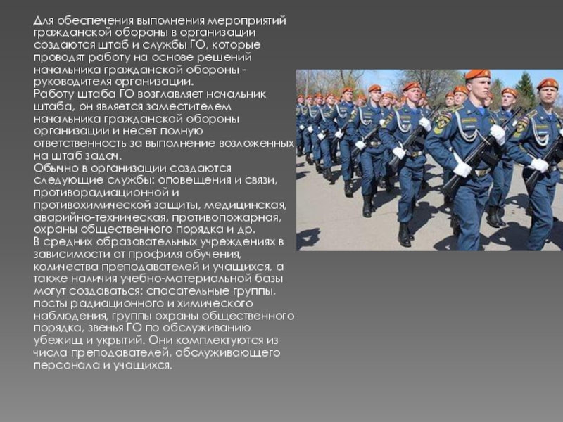 Слайд 10Для обеспечения выполнения мероприятий гражданской обороны в организации создаются штаб и