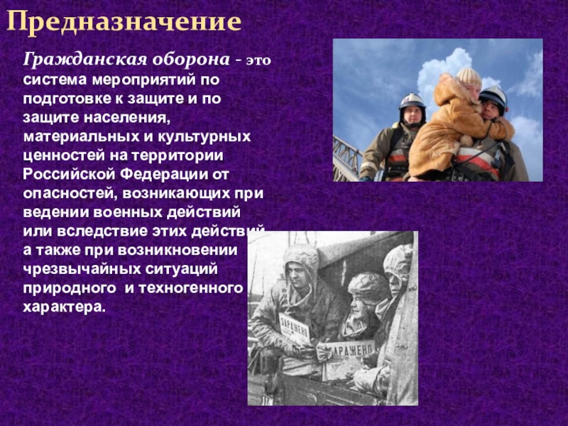 ПредназначениеГражданская оборона - это система мероприятий по подготовке к защите и по защите населения, материальных и культурных