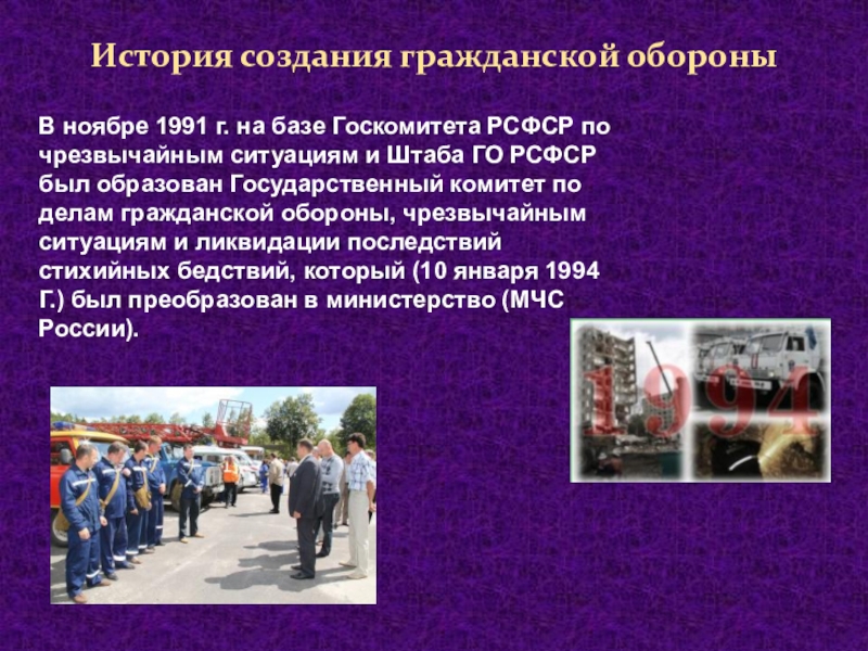 История создания гражданской обороныВ ноябре 1991 г. на базе Госкомитета РСФСР по чрезвычайным ситуациям и Штаба ГО
