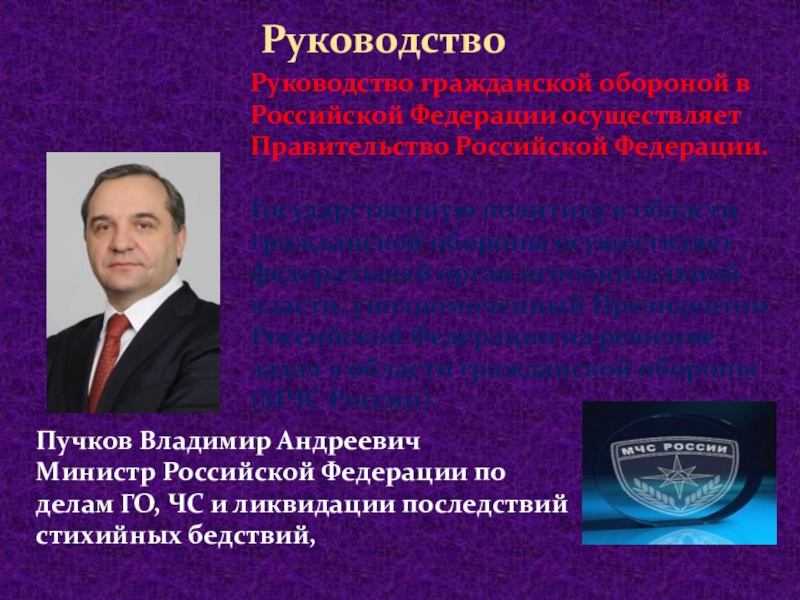 Министр Российской Федерации по делам ГО, ЧС и ликвидации последствий стихийных бедствий,