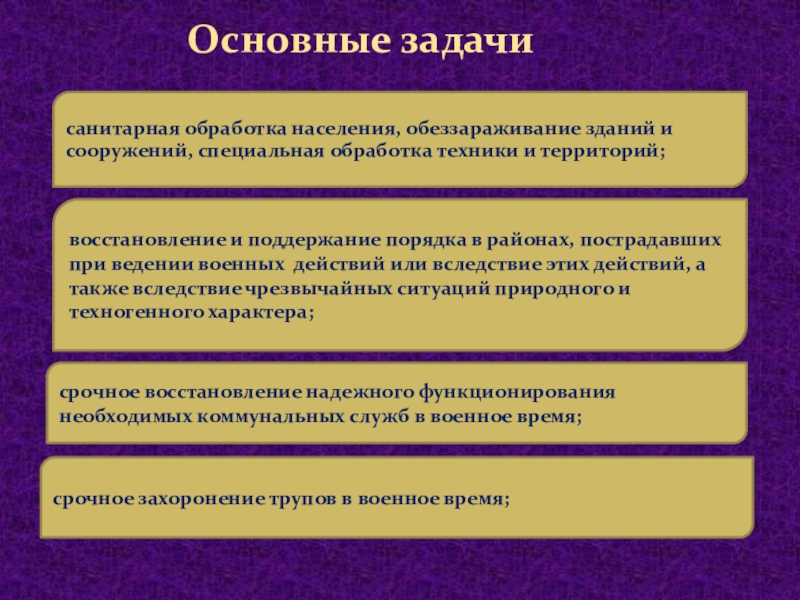 Основные задачисанитарная обработка населения, обеззараживание зданий и сооружений, специальная обработка техники и территорий;восстановление и поддержание порядка в