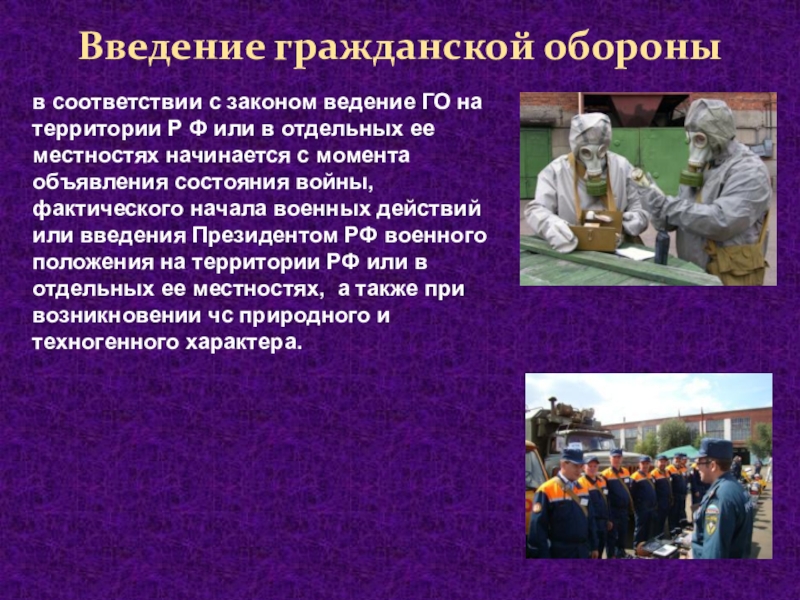 Введение гражданской обороныв соответствии с законом ведение ГО на территории Р Ф или в отдельных ее местностях