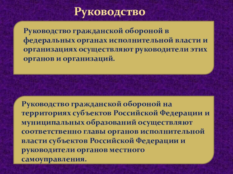 РуководствоРуководство гражданской обороной в федеральных органах исполнительной власти и организациях осуществляют руководители этих органов и организаций. Руководство