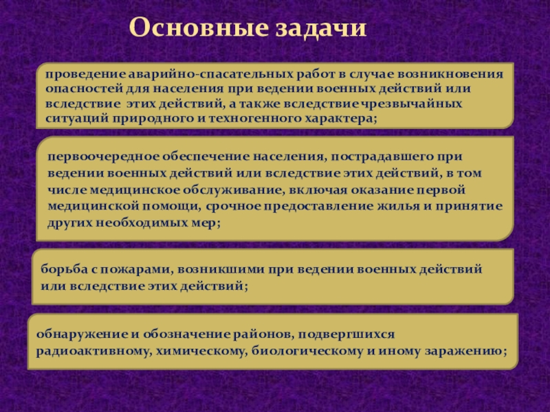 Основные задачипроведение аварийно-спасательных работ в случае возникновения опасностей для населения при ведении военных действий или вследствие этих