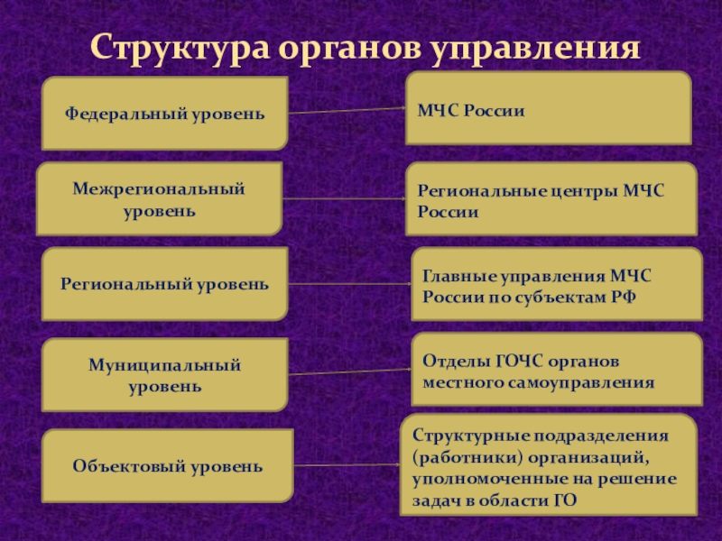 Структура органов управленияФедеральный уровень Межрегиональный уровень Региональный уровень Муниципальный уровень Объектовый уровень МЧС РоссииРегиональные центры МЧС России