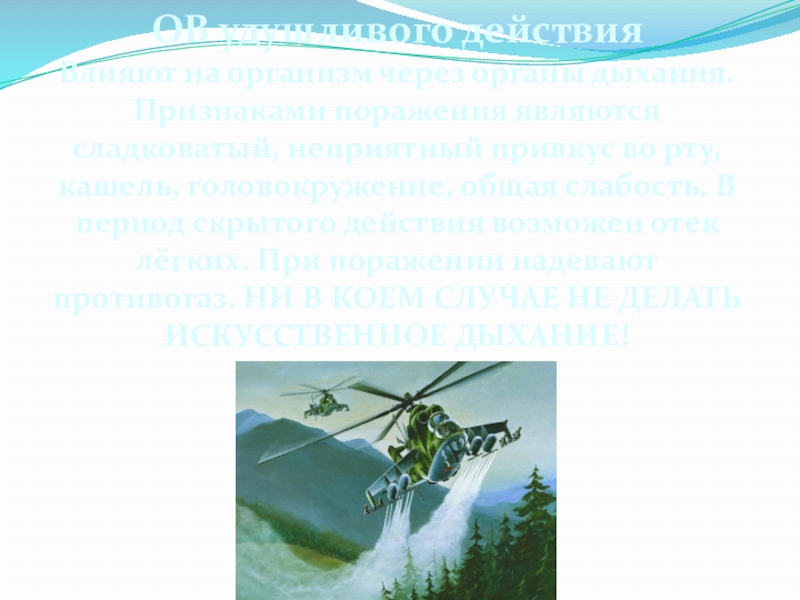 они не действуют). Признаками поражения являются: металлический привкус во рту, раздражение горла, головокружения, слабость, тошнота, рвота, резкие судороги, паралич