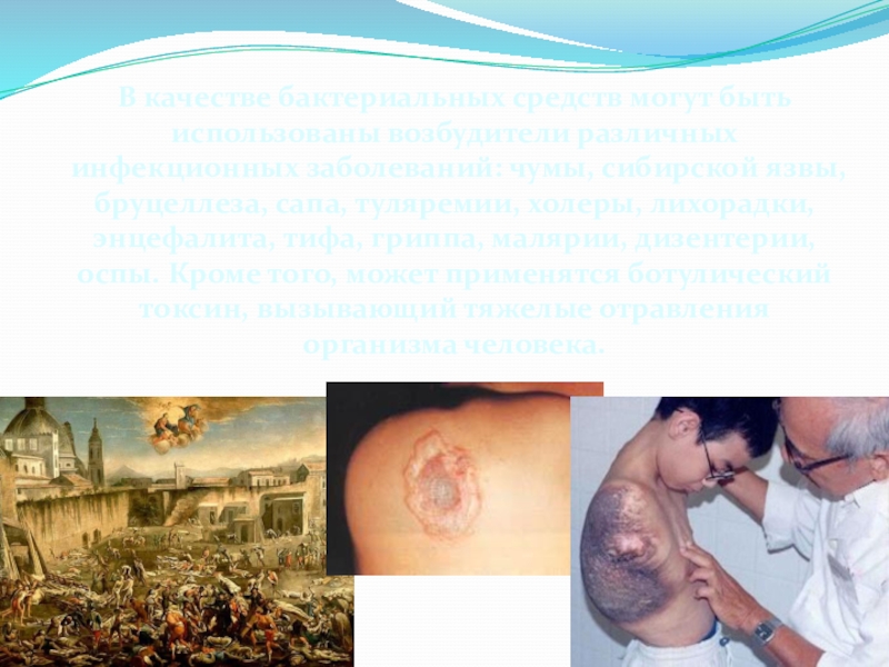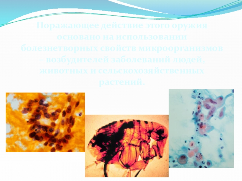 Слайд 13Поражающее действие этого оружия основано на использовании болезнетворных свойств микроорганизмов –