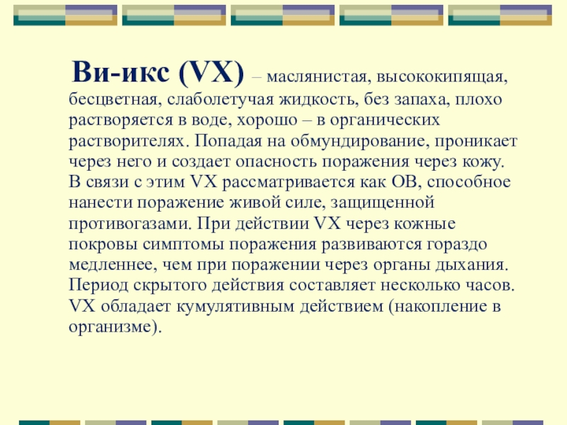 Слайд 10 Ви-икс (VX) – маслянистая, высококипящая, бесцветная, слаболетучая жидкость,