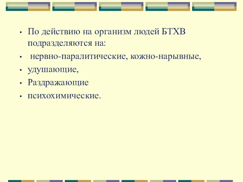 Слайд 7По действию на организм людей БТХВ подразделяются на: