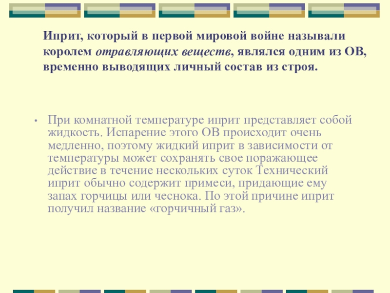 Слайд 13Иприт, который в первой мировой войне называли королем отравляющих веществ, являлся