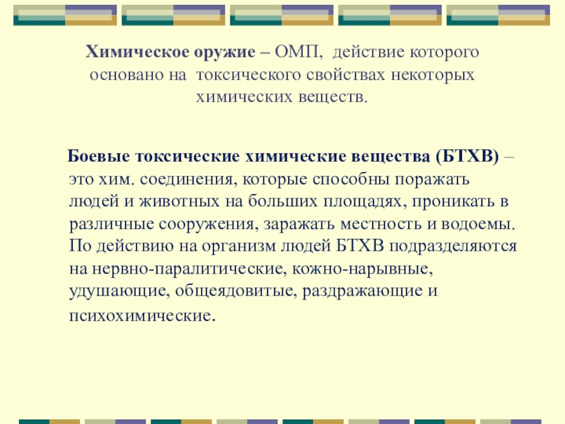 Слайд 2Химическое оружие – ОМП, действие которого основано на токсического свойствах некоторых