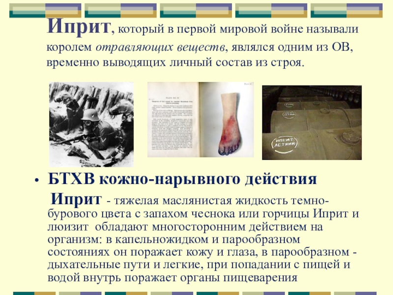 Иприт - тяжелая маслянистая жидкость темно-бурового цвета с запахом чеснока или горчицы Иприт и люизит обладают многосторонним действием на организм: в капельножидком и парообразном состояниях он поражает кожу и глаза, в парообразном - дыхательные пути и легкие, при попадании с пищей и водой внутрь поражает органы пищеварения