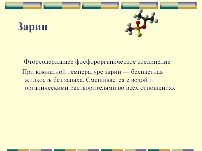 зарин — бесцветная жидкость без запаха. Смешивается с водой и органическими растворителями во всех отношениях