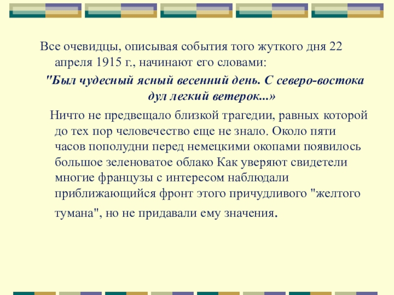 Слайд 5Все очевидцы, описывая события того жуткого дня 22 апреля 1915 г.,