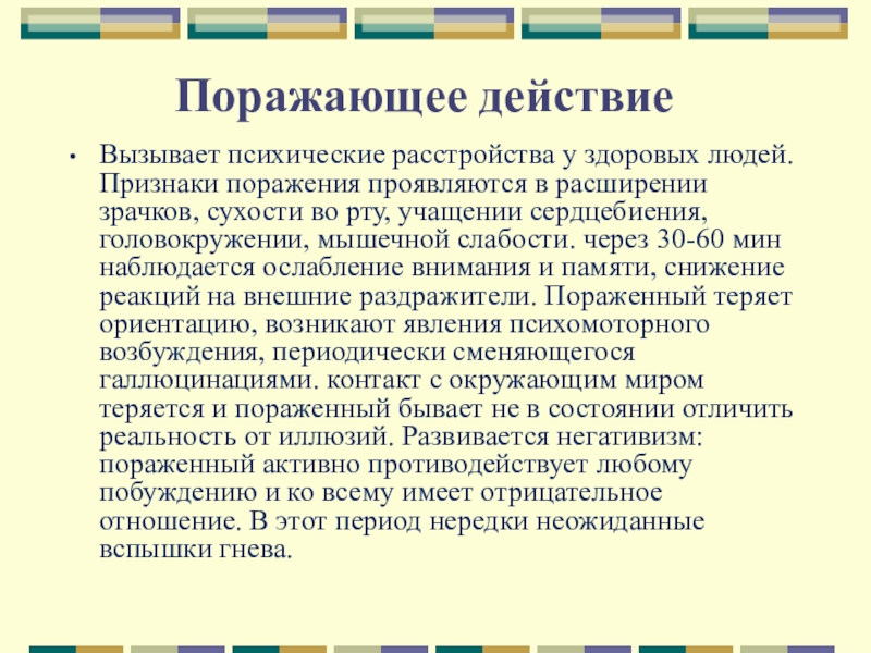 расширении зрачков, сухости во рту, учащении сердцебиения, головокружении, мышечной слабости. через 30-60 мин наблюдается ослабление внимания и памяти, снижение реакций на внешние раздражители. Пораженный теряет ориентацию, возникают явления психомоторного возбуждения, периодически сменяющегося галлюцинациями. контакт с окружающим миром теряется и пораженный бывает не в состоянии отличить реальность от иллюзий. Развивается негативизм: пораженный активно противодействует любому побуждению и ко всему имеет отрицательное отношение. В этот период нередки неожиданные вспышки гнева.