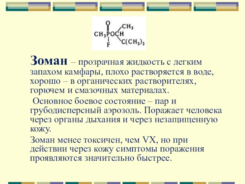 Слайд 11 Зоман – прозрачная жидкость с легким запахом камфары, плохо