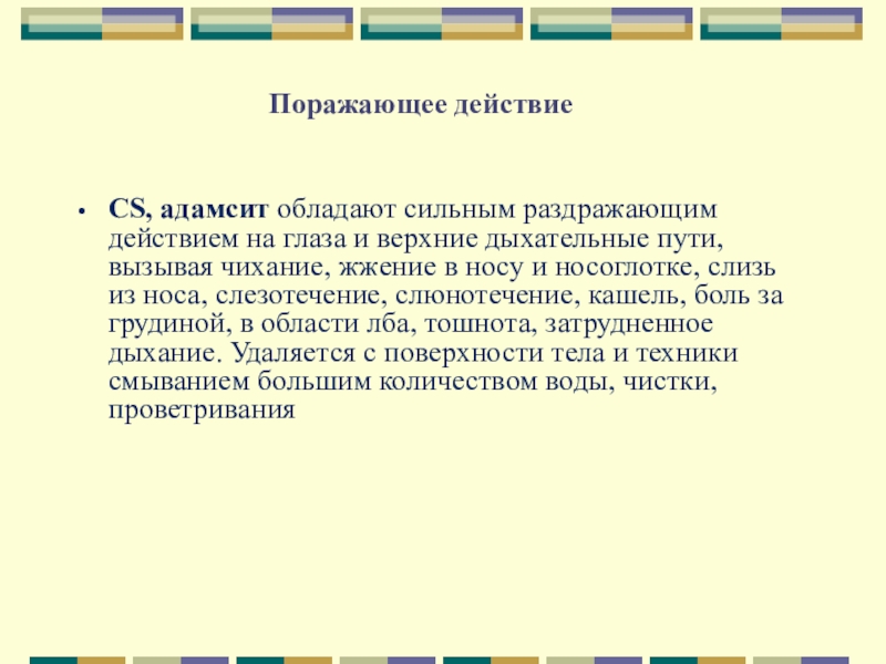 CS, адамсит обладают сильным раздражающим действием на глаза и верхние