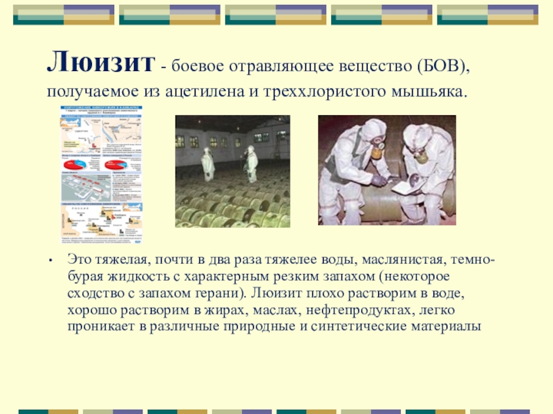 Слайд 15Люизит - боевое отравляющее вещество (БОВ), получаемое из ацетилена и треххлористого