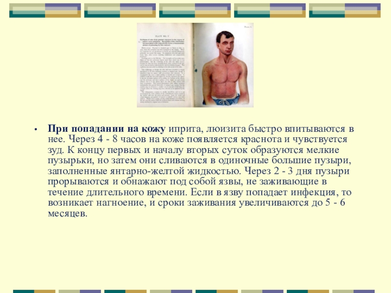 Слайд 16При попадании на кожу иприта, люизита быстро впитываются в нее. Через