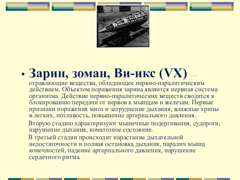 Слайд 12Зарин, зоман, Ви-икс (VX) — отравляющие вещества, обладающее нервно-паралитическим действием. Объектом