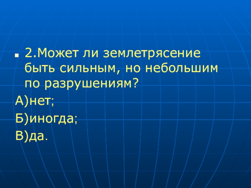 2.Может ли землетрясение быть сильным, но небольшим по разрушениям?А)нет;Б)иногда;В)да.