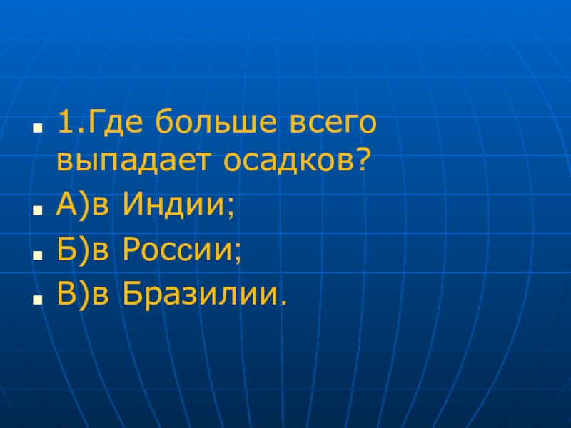 1.Где больше всего выпадает осадков?А)в Индии;Б)в России;В)в Бразилии.