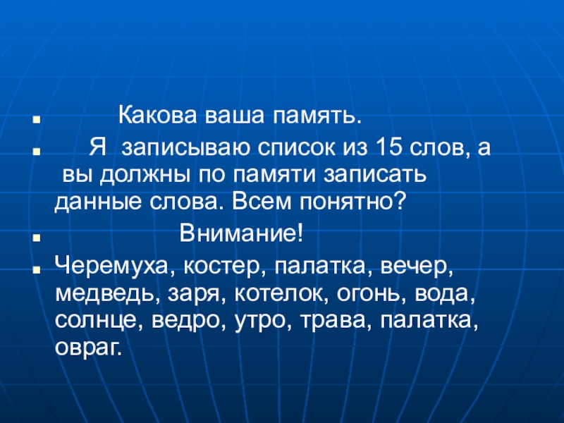 записываю список из 15 слов, а вы должны по памяти записать данные слова. Всем понятно?