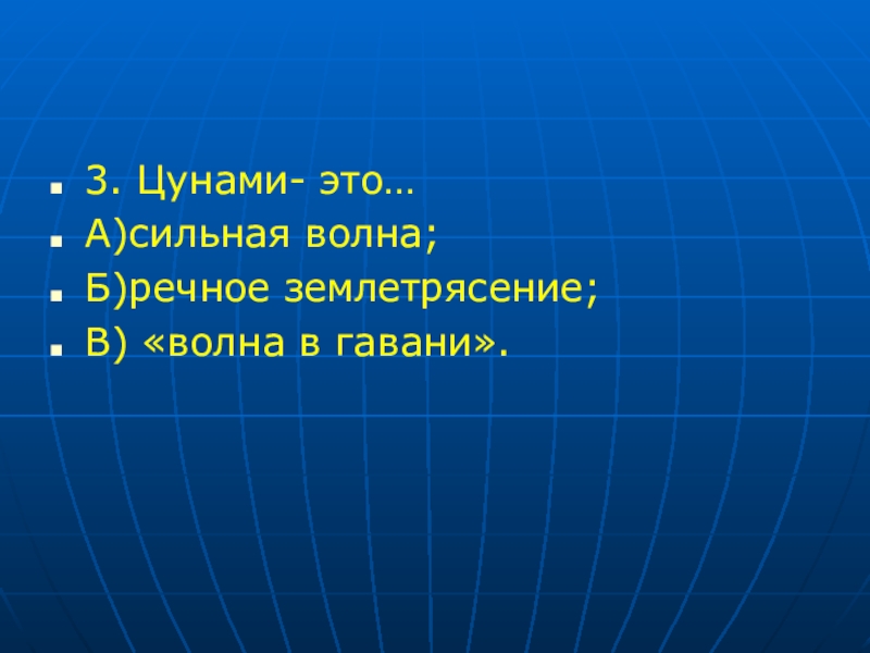 3. Цунами- это…А)сильная волна;Б)речное землетрясение;В) «волна в гавани».
