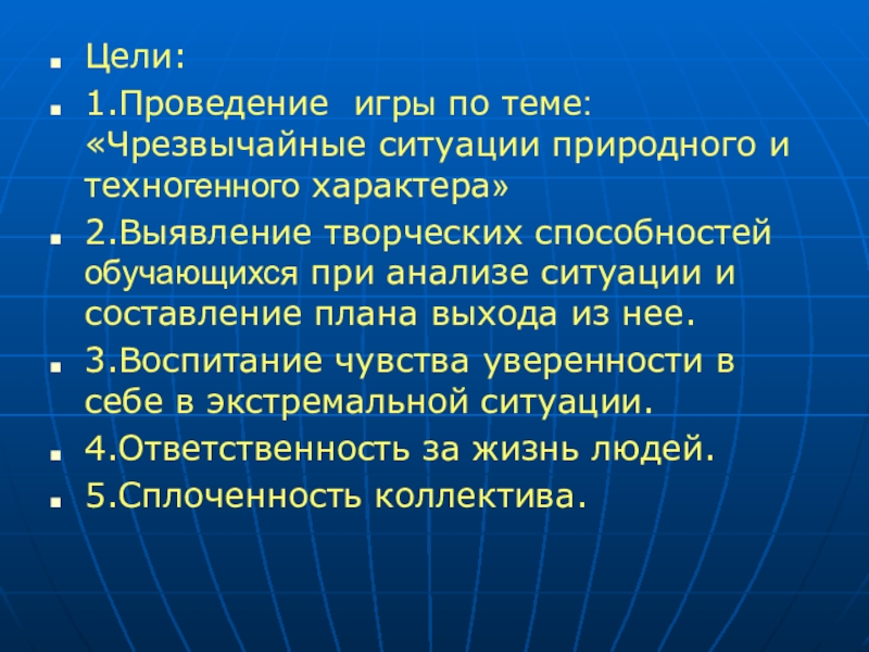 Цели:1.Проведение игры по теме: «Чрезвычайные ситуации природного и техногенного характера»2.Выявление творческих способностей обучающихся при анализе ситуации и составление плана выхода из нее.3.Воспитание чувства уверенности в себе в экстремальной ситуации.4.Ответственность за жизнь людей.5.Сплоченность коллектива.