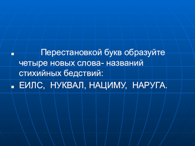 Перестановкой букв образуйте 	четыре новых слова- названий 	стихийных бедствий:ЕИЛС, НУКВАЛ, НАЦИМУ,