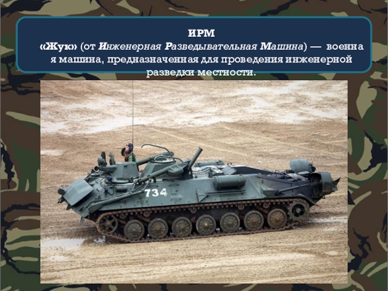 Слайд 3ИРМ «Жук» (от Инженерная Разведывательная Машина) —  военная машина, предназначенная для проведения инженерной разведки местности.