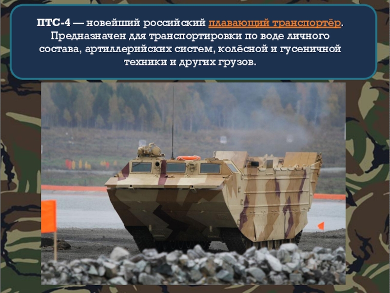 Слайд 9ПТС-4 — новейший российский плавающий транспортёр.