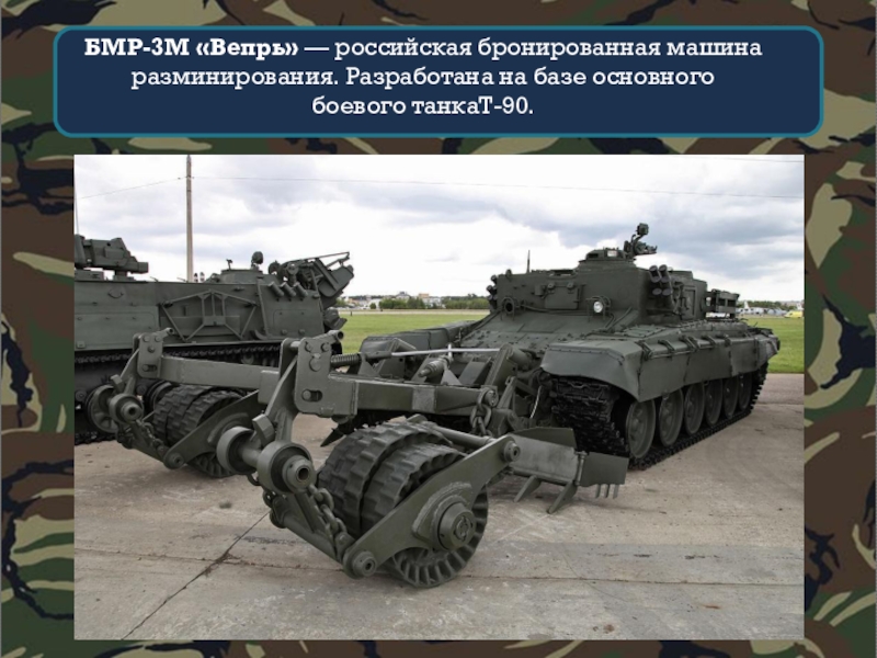 Слайд 13БМР-3М «Вепрь» — российская бронированная машина разминирования. Разработана на базе основного боевого танкаТ-90.
