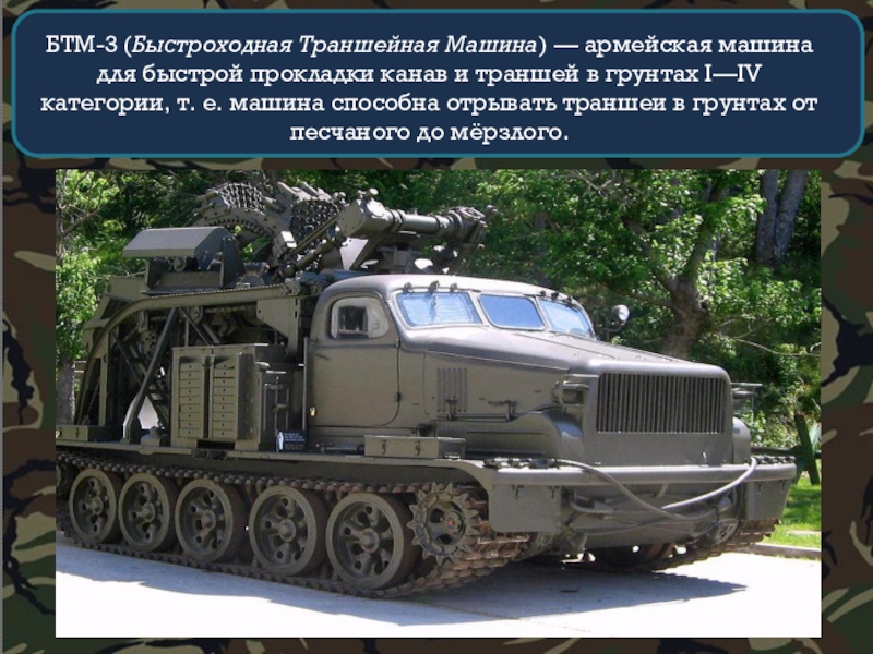 Слайд 11БТМ-3 (Быстроходная Траншейная Машина) — армейская машина для быстрой прокладки канав и траншей в грунтах