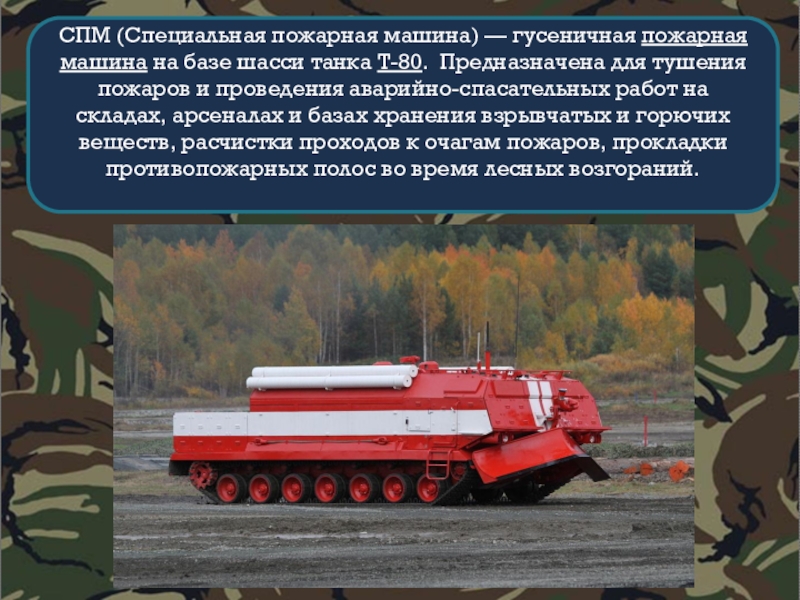 Слайд 4СПМ (Специальная пожарная машина) — гусеничная пожарная машина на базе шасси танка Т-80. Предназначена для тушения пожаров