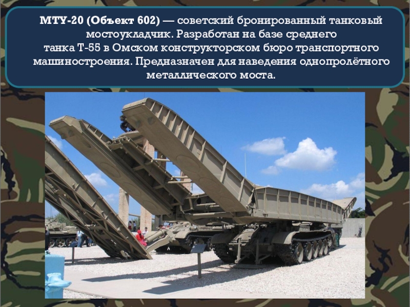 Слайд 7МТУ-20 (Объект 602) — советский бронированный танковый мостоукладчик. Разработан на базе среднего танка Т-55 в Омском конструкторском бюро транспортного