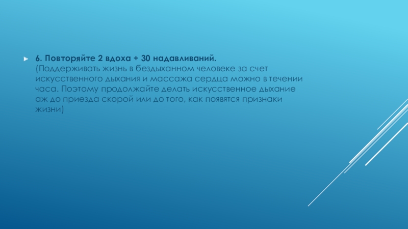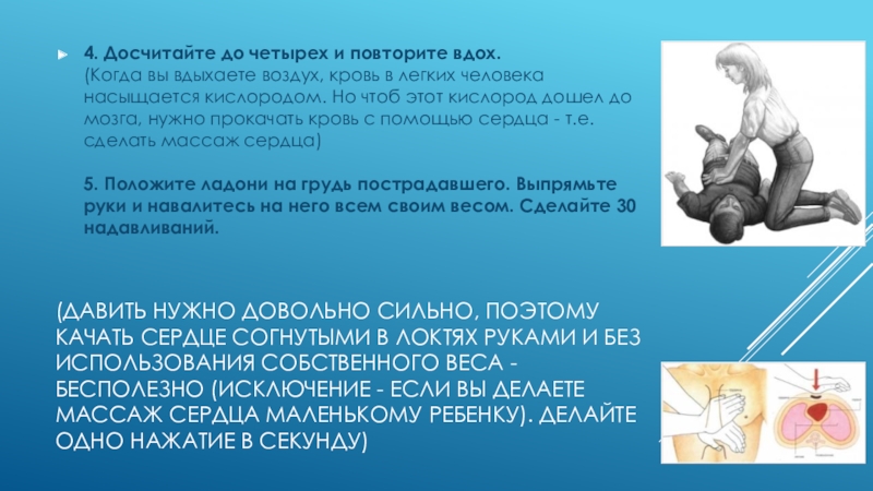 (Когда вы вдыхаете воздух, кровь в легких человека насыщается кислородом. Но чтоб этот кислород дошел до мозга, нужно прокачать кровь с помощью сердца - т.е. сделать массаж сердца)