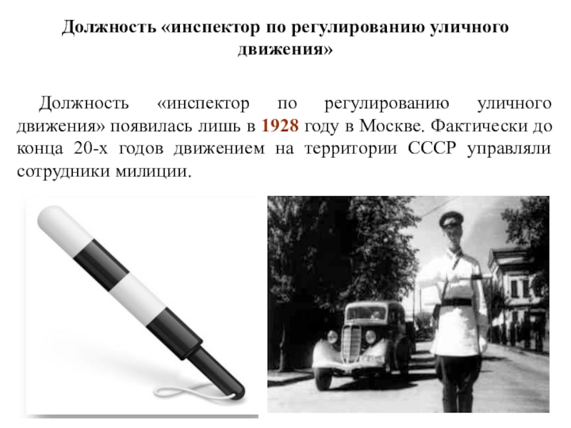 Слайд 10Должность «инспектор по регулированию уличного движения» появилась лишь в 1928 году