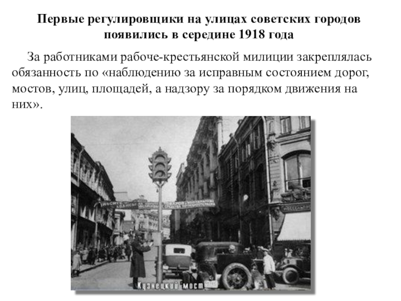 Слайд 7Первые регулировщики на улицах советских городов появились в середине 1918 года