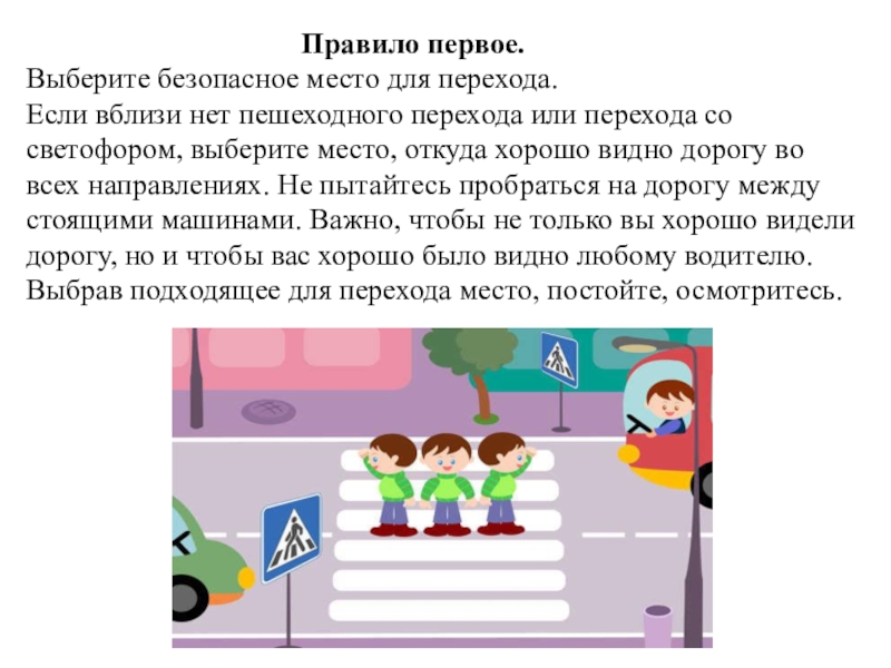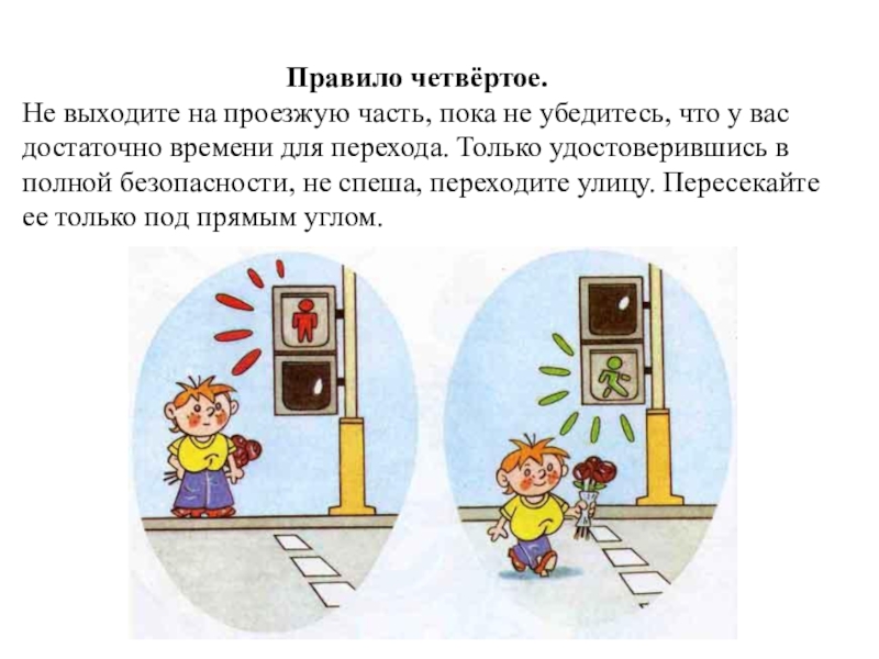 Не выходите на проезжую часть, пока не убедитесь, что у вас достаточно времени для перехода. Только удостоверившись в полной безопасности, не спеша, переходите улицу. Пересекайте ее только под прямым углом.