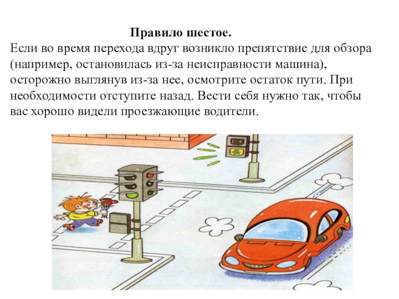 Если во время перехода вдруг возникло препятствие для обзора (например, остановилась из-за неисправности машина), осторожно выглянув из-за нее, осмотрите остаток пути. При необходимости отступите назад. Вести себя нужно так, чтобы вас хорошо видели проезжающие водители.