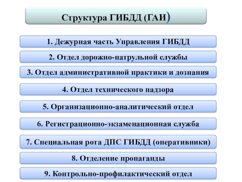 отдельным направлениям работы в составе ГАИ образуются строевые подразделения дорожно-патрульной службы, подразделения по организации дорожного движения, диагностические станции для проведения государственного технического осмотра транспортных средств, межрайонные регистрационно-экзаменационные отделы.