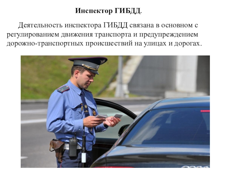 Слайд 19Деятельность инспектора ГИБДД связана в основном с регулированием движения транспорта и