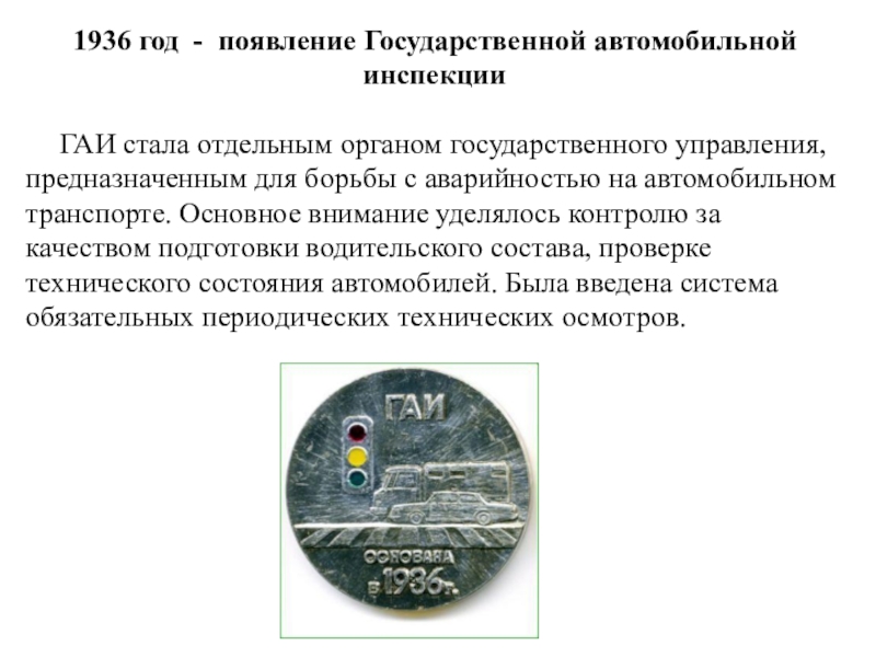 Слайд 61936 год - появление Государственной автомобильной инспекции