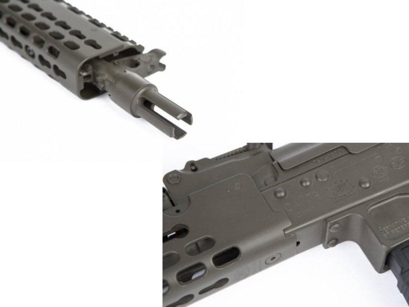 оснащен дульным тормозом-компенсатором несколько измененной конструкции, который позволяет стрелять винтовочными гранатами иностранного производства.