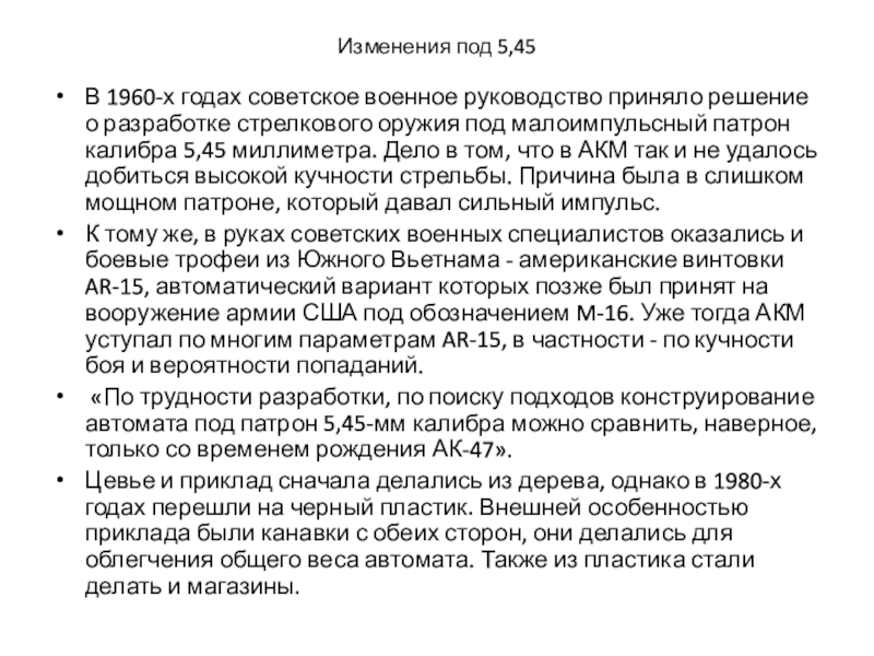 разработке стрелкового оружия под малоимпульсный патрон калибра 5,45 миллиметра. Дело в том, что в АКМ так и не удалось добиться высокой кучности стрельбы. Причина была в слишком мощном патроне, который давал сильный импульс.