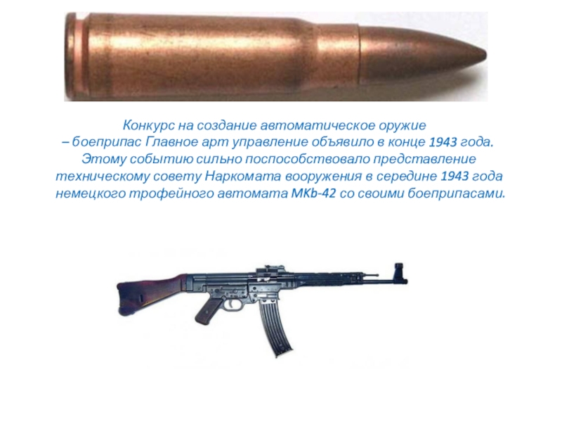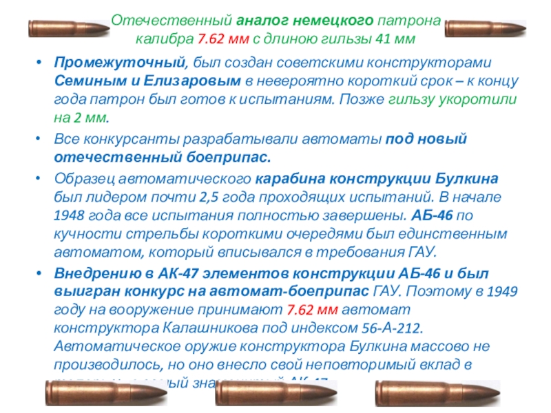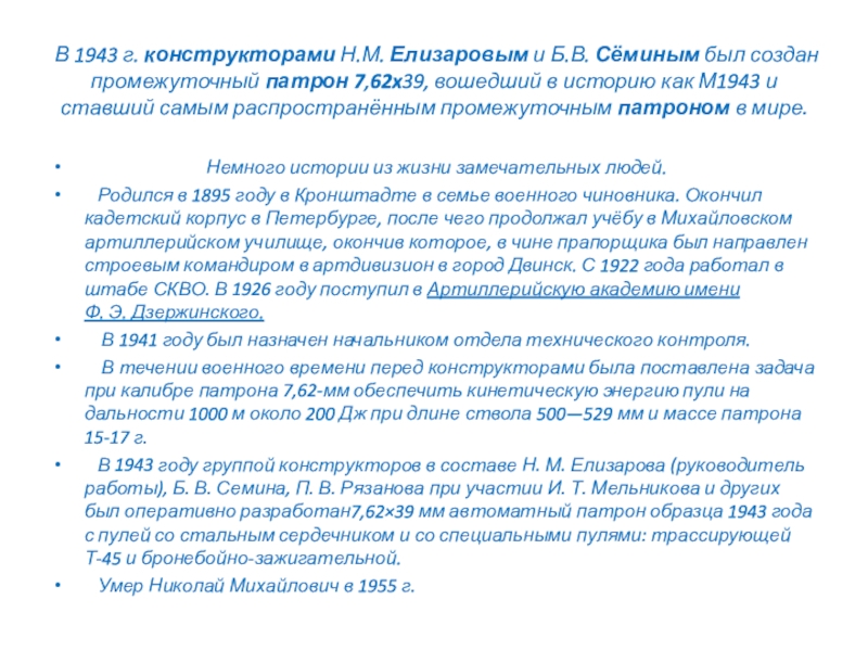 Слайд 17В 1943 г. конструкторами Н.М. Елизаровым и Б.В. Сёминым был создан промежуточный патрон 7,62x39, вошедший в историю как М1943