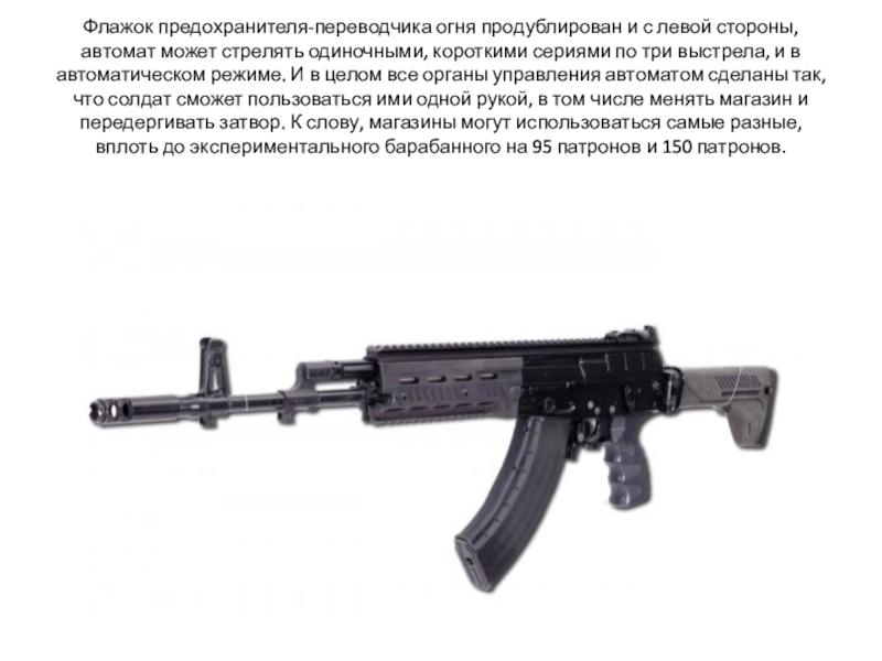 Слайд 63Флажок предохранителя-переводчика огня продублирован и с левой стороны, автомат может стрелять