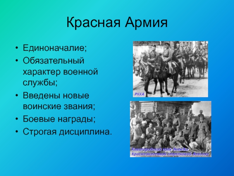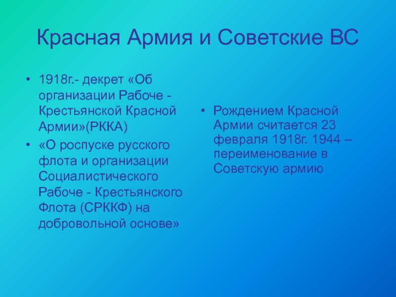 Рождением Красной Армии считается 23 февраля 1918г. 1944 – переименование в Советскую армию